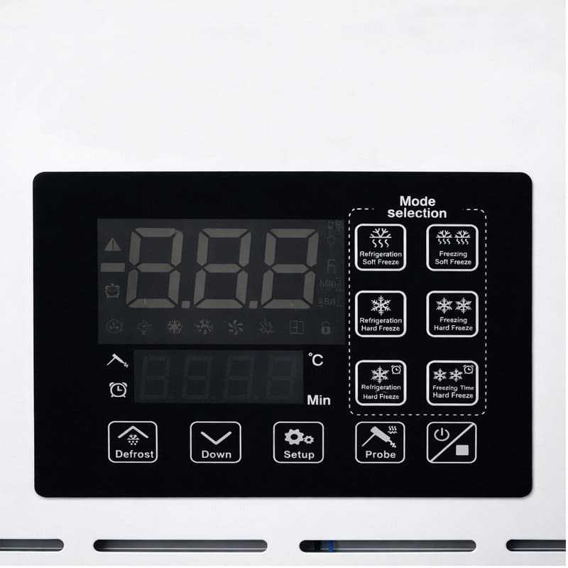 Contiene una sonda de penetración para medir la temperatura del interior del producto y configurar el abatidor para que se detenga a la temperatura programada.