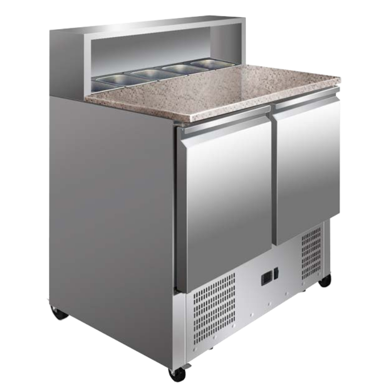 Con una capacidad de 390 litros y 2 puertas de cristal, este bajo mostrador te permite organizar y exhibir tus productos de manera eficiente. Su sistema de refrigeración por enfriamiento forzado (no frost) mantiene una temperatura precisa entre -2 °C y +8 °C. El compresor DANFOSS SECOP, de bajo consumo y que utiliza gas ecológico R-290, garantiza un funcionamiento eficiente y respetuoso con el medio ambiente.