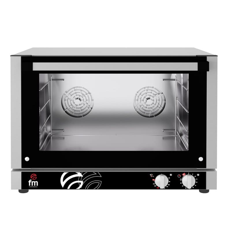 Descubre el horno de convección RX-203 de 2250W, un potente equipo de la marca española FM con capacidad 3 bandejas GN1/2 y unas medidas ideales de 500x560x455 mm.