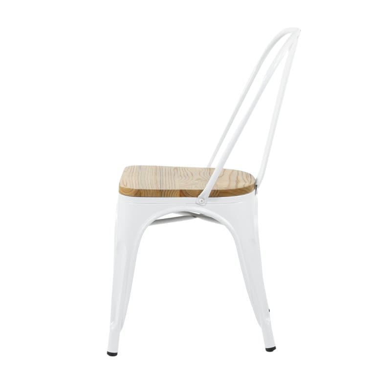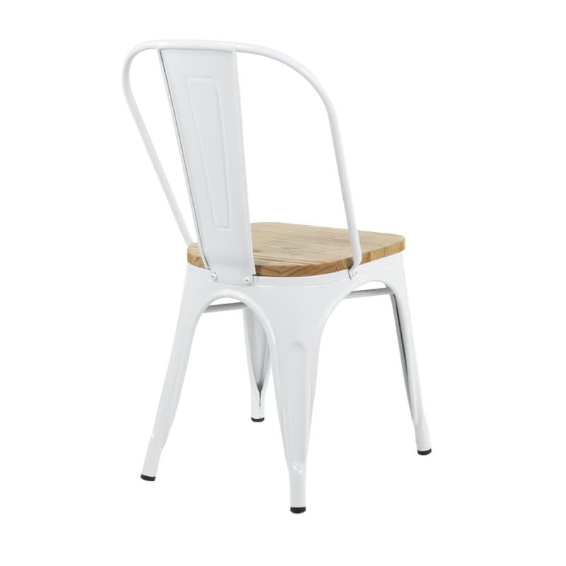 Silla de estilo industrial fabricada en acero pintado brillante, resistente y apta para uso en interiores y exteriores. Incorpora un asiento de madera maciza de pino que aporta calidez y comodidad, siendo una opción duradera y funcional para hostelería y hogar.