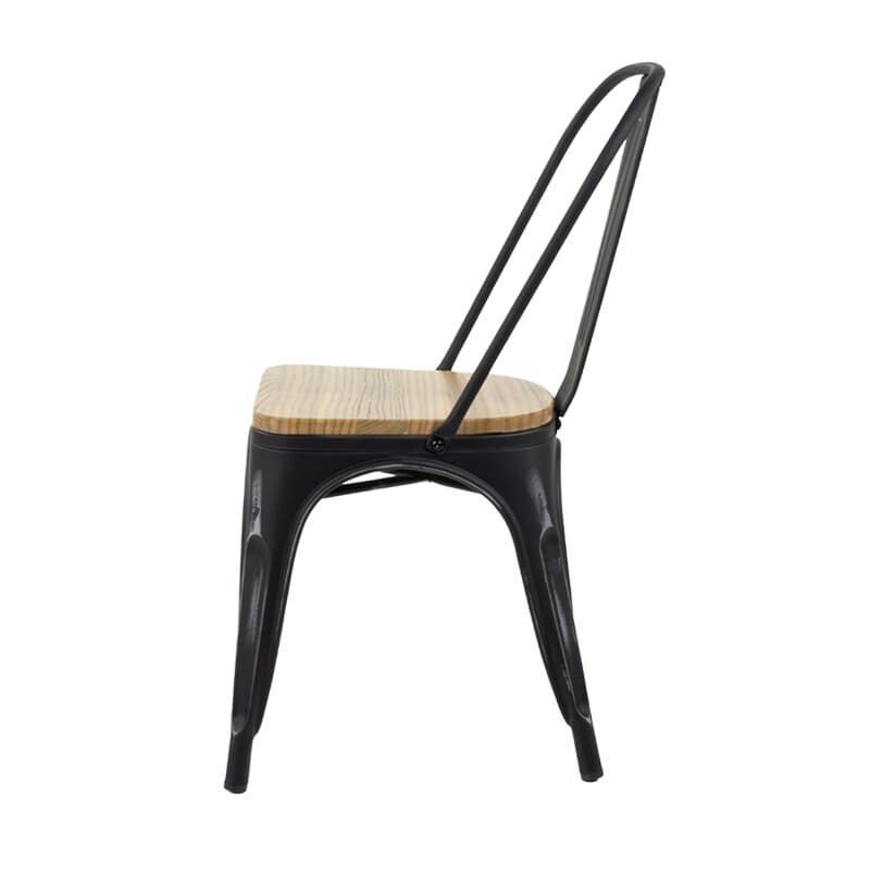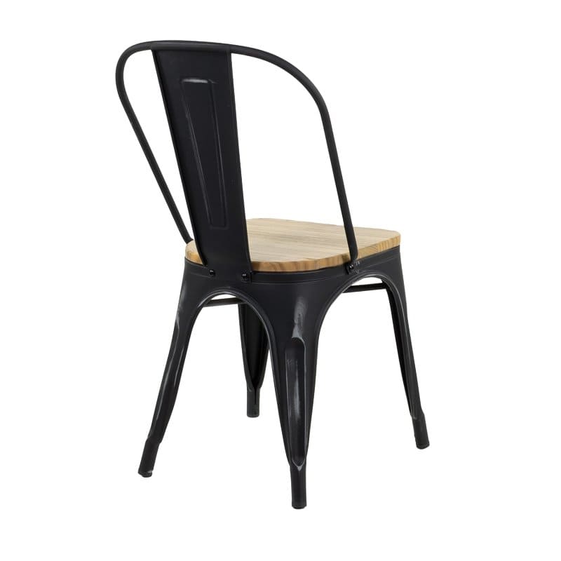 Silla de estilo industrial fabricada en acero pintado brillante, resistente y apta para uso en interiores y exteriores. Incorpora un asiento de madera maciza de pino que aporta calidez y comodidad, siendo una opción duradera y funcional para hostelería y hogar.
