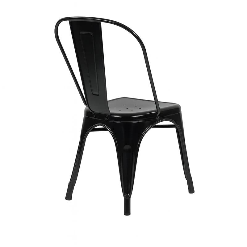 Silla Tool de acero pintado en brillo, ligera, resistente y apilable. Su diseño industrial aporta estilo y funcionalidad tanto en interiores como en exteriores. Perfecta para hostelería gracias a su durabilidad y fácil limpieza.